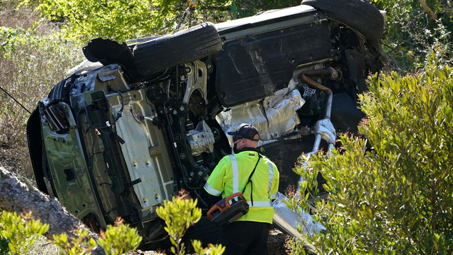 The vehicle driven by golfer tiger woods lies on its side in rancho palos verdes, california, on february 23, 2021, after a rollover accident.